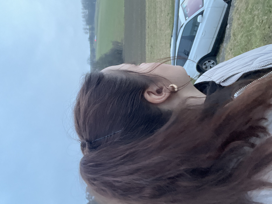 A rotated, close-up view captures a woman with brown hair styled in a low ponytail, secured with a bobby pin. She is wearing a gold hoop earring. Her head is tilted back, looking upwards. In the background, a blurry landscape featuring a green field and cloudy sky is visible. A white car is partially seen on the right side of the frame.