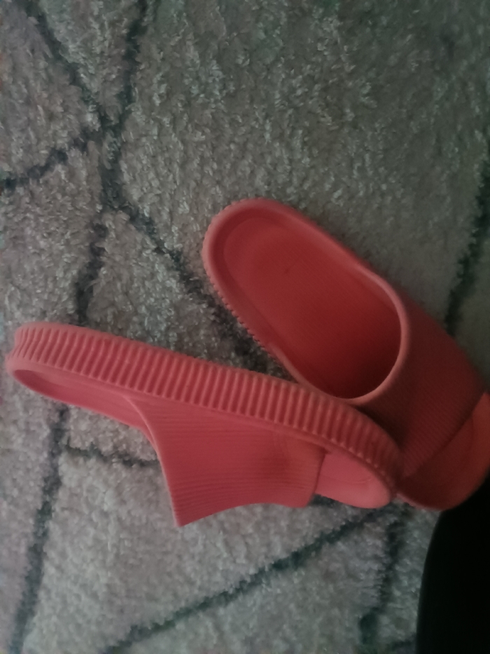Two coral-colored rubber slide sandals rest on a gray and white textured rug. One sandal is slightly overlapping the other. The sandal on the left reveals the sole with ridged edges. A portion of a black object is visible in the lower right corner of the image.