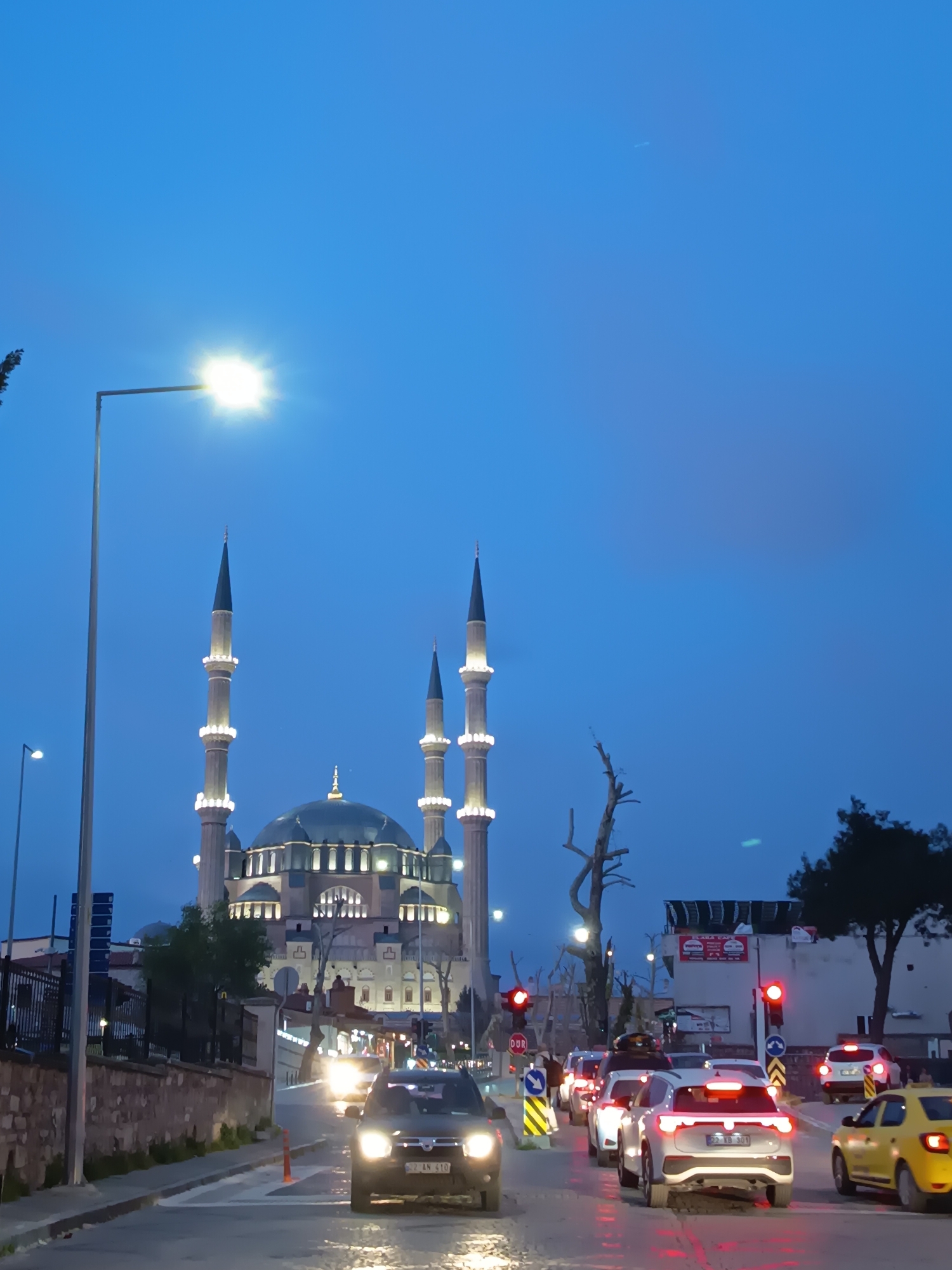 street in Edirne Merkez, Turkey, at dusk or night. A large mosque with multiple minarets is visible in the background, illuminated. Traffic is heavy on the road, with several cars stopped at a red traffic light. A street lamp is on, casting a bright light. The sky is a deep blue. Buildings and trees are visible along the side of the road. A sign for the city of "DUR" is seen in the street.