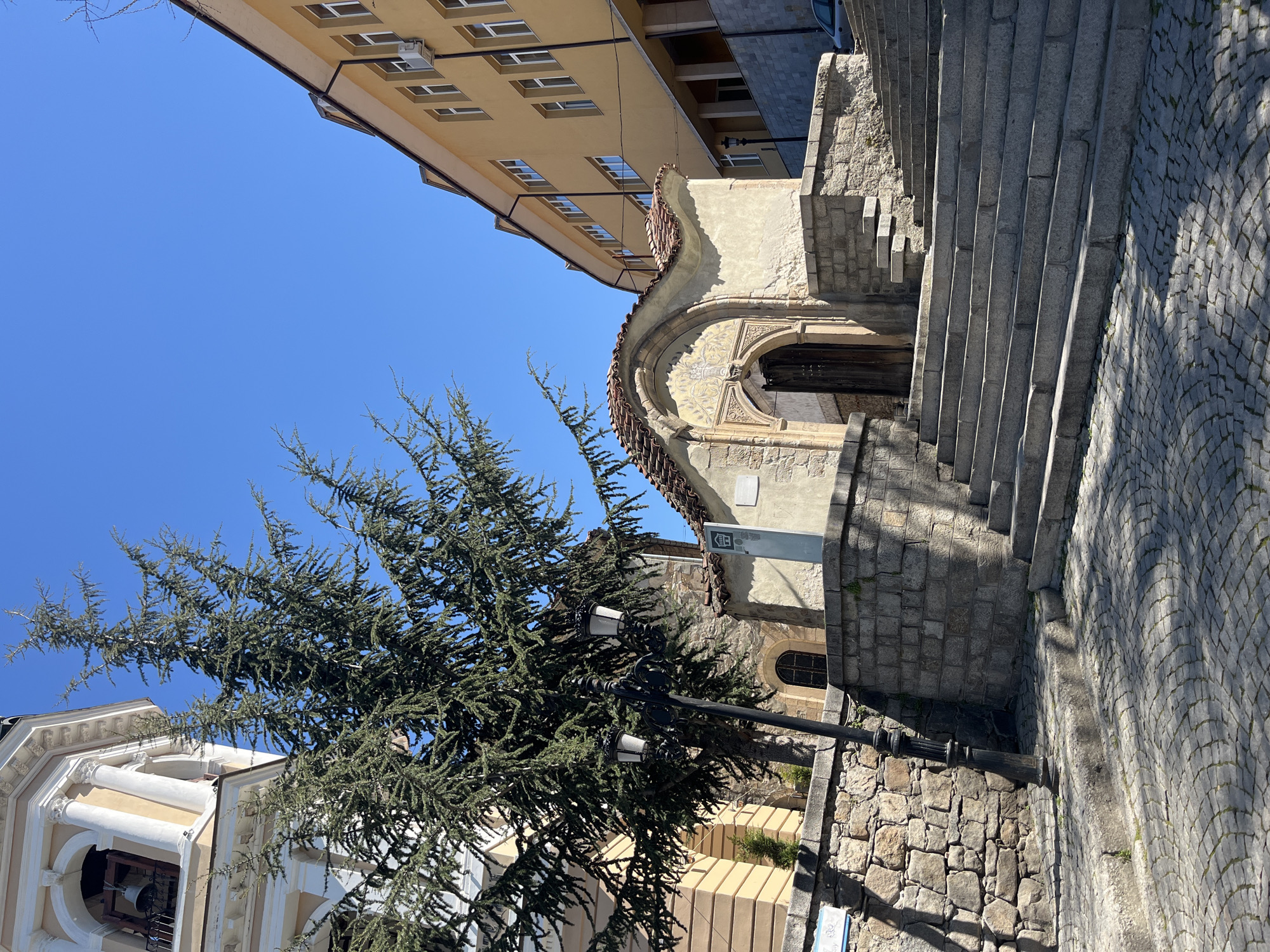 street scene in Plovdiv, Bulgaria, dominated by the Church of Saints Constantine and Helena, viewed from a low angle