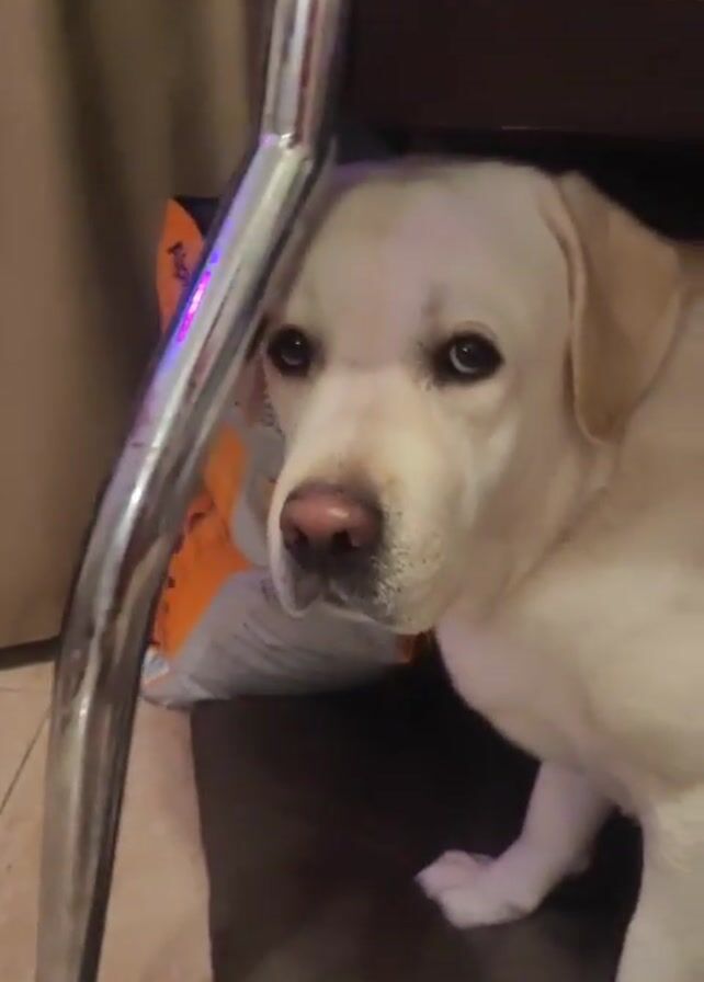 A video shows a light-colored Labrador dog