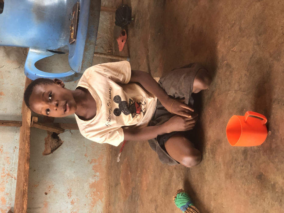A young child, appearing male, with dark skin and short dark hair, kneels on a reddish-brown earthen floor within an interior room in Ukwu-Abwa, Nigeria