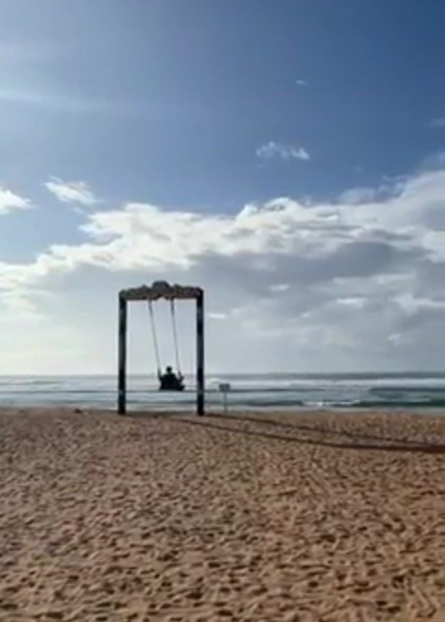 person swinging on a swing set on a beach
