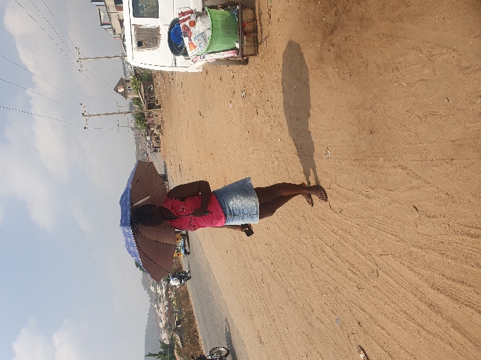 The scene depicts a sunny outdoor environment with a dirt road shoulder adjacent to a paved road in Burwood, Australia. In the foreground, a dark-skinned individual, appearing female, stands facing slightly left of the camera. She wears a pink collared shirt and a light blue denim skirt, and is barefoot. She holds an open blue and white umbrella overhead with her right hand for shade and a black smartphone in her left hand, which rests at her side. Her distinct shadow extends to her right on the sandy ground, which shows tire tracks. To the left, a paved road is visible, with a motorcyclist passing in the mid-ground. To the right, a white van is parked on the dirt shoulder, facing away from the camera. The van's rear contains a green plastic container filled with various items. Utility poles with power lines run along the right side of the road. The background features rolling hills dotted with scattered buildings under a clear sky with sparse clouds.
