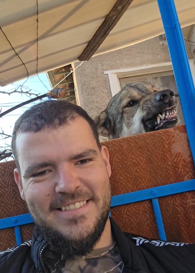 - "A man is taking a selfie while a large dog appears to growl behind him" by FM-3O4tD2, licensed under CC BY 4.0