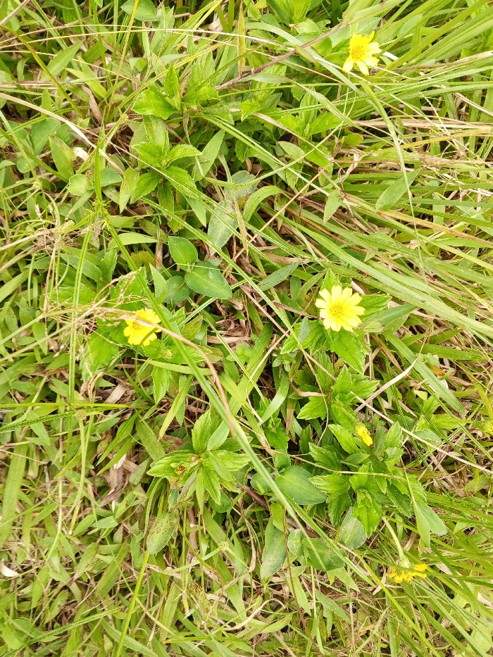 The image displays a dense patch of ground-level vegetation located in Thotagamuwa, Sri Lanka. The scene is composed primarily of various green grasses and herbaceous plants, forming an interwoven mat. Interspersed throughout the greenery are several small, yellow, daisy-like composite flowers, each exhibiting distinct yellow petals surrounding a central disc. A total of five such flowers are clearly visible, distributed across the frame. The environment is indicative of an uncultivated outdoor setting under ambient daylight conditions. No human or animal subjects, nor any artificial objects or structures, are present within the captured area.