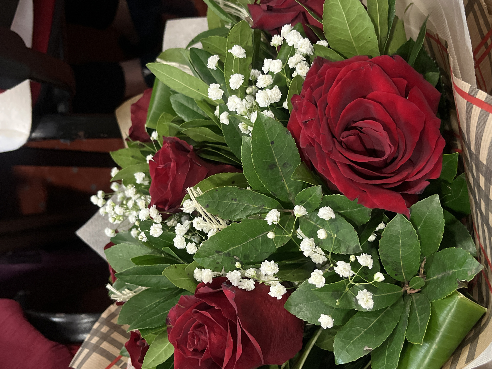 A floral bouquet is depicted in a close-up, high-angle shot, positioned within an unidentifiable indoor setting in Sofia, Bulgaria. The bouquet consists of several deep red roses, interspersed with numerous clusters of small white gypsophila (baby's breath) and abundant dark green foliage. The wrapping material for the bouquet features a beige base with a brown checkered pattern and thin red stripes. In the blurred background, an indistinct dark reddish-brown object, possibly upholstery or clothing, is visible in the upper left. A white, geometric shape, potentially a napkin or menu, is present in the upper right, with darker, blurred forms suggestive of furniture or people beneath it, including a possible human leg or shoe. No specific actions or interactions are discernible; the scene presents a static arrangement.