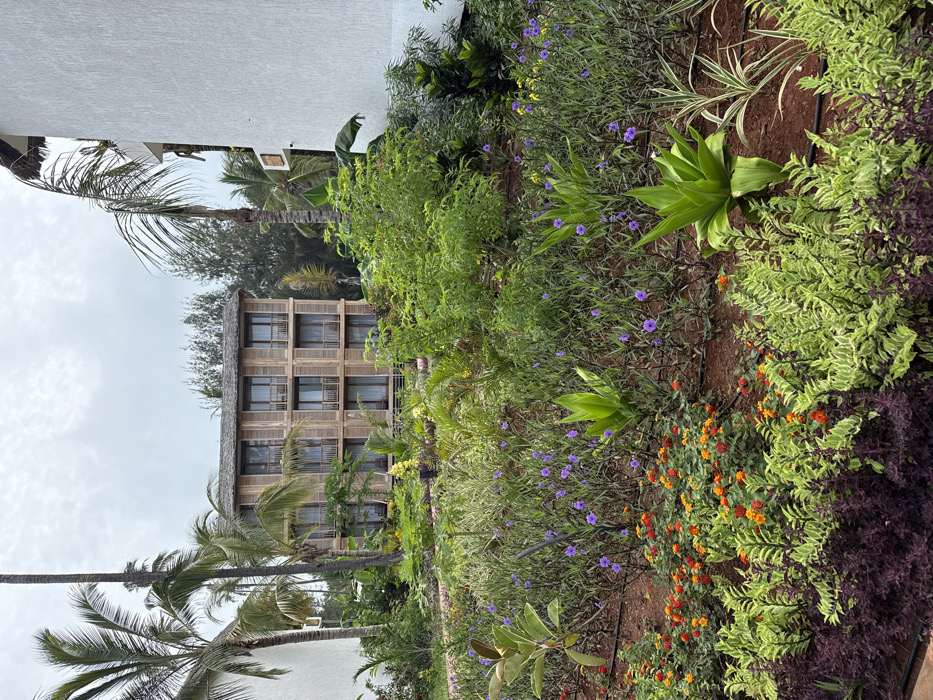 A lush, vibrant garden scene displays a variety of plants, including orange lantana, purple ruellia, and variegated foliage. Behind the garden, a multi-story building with wooden facades and a thatched roof is partially visible. Palm trees add to the tropical ambiance. The sky is overcast, suggesting a humid climate. The garden is well-maintained, with a drip irrigation system visible in the soil. A white wall of a nearby building is also seen.