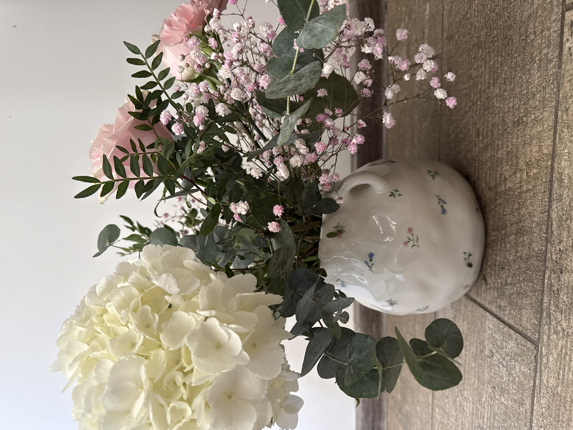 A vase of flowers sits on a surface, with a white wall in the background. The flowers include a white hydrangea, pink carnations, baby's breath with pink and white blossoms, and eucalyptus leaves. The vase is white with small floral designs. The surface appears to be a wood-look tile. The image does not contain information that would locate it in the city of Kazan, Russia.