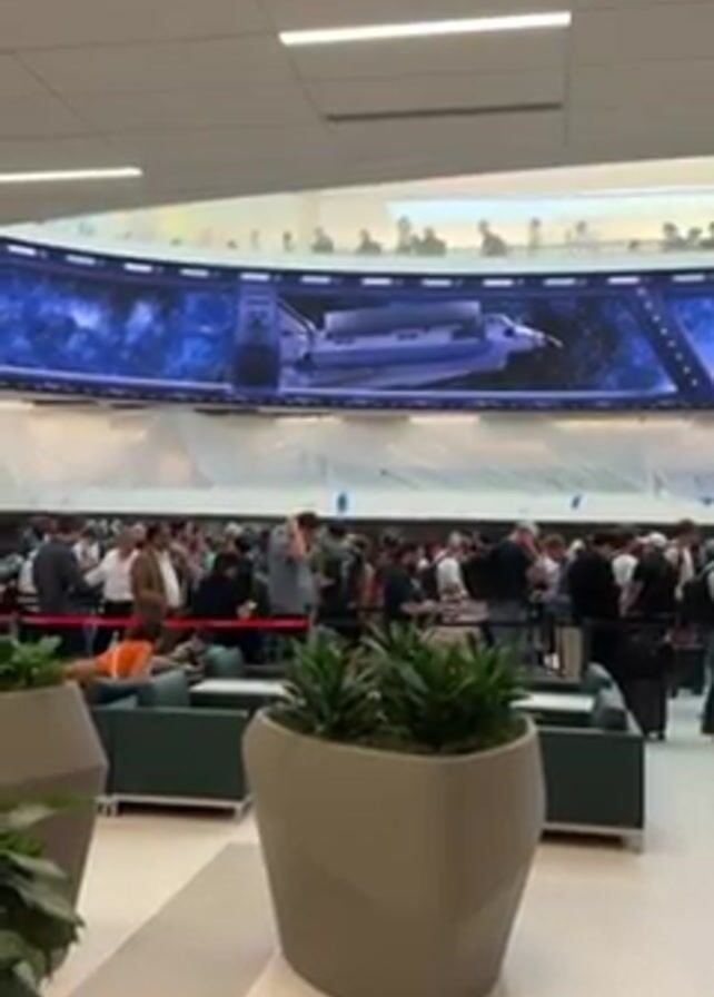 The camera pans slowly in an indoor space to reveal a crowd of people standing in line. Many have luggage, suggesting an airport or travel hub. An enormous curved screen above the crowd displays footage of a space shuttle. There are a few people sitting on lounge chairs and some potted plants nearby. Some people are interacting with each other, others appear to be waiting patiently in the queue. The overall atmosphere seems calm and orderly.