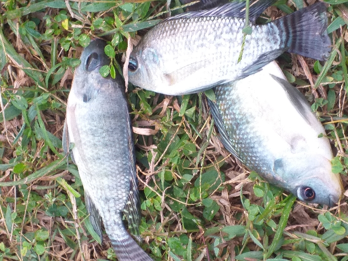 Three deceased fish are depicted lying on a patch of green and brown grass
