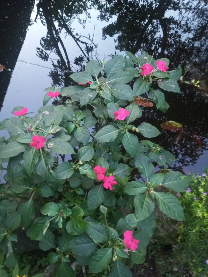 - "The image depicts an outdoor botanical scene in Ciherang, Indonesia, featuring a vibrant fuchsia-flowered plant positioned at the edge of a dark, still body of water" by FM-AX1Wz1, licensed under CC BY 4.0