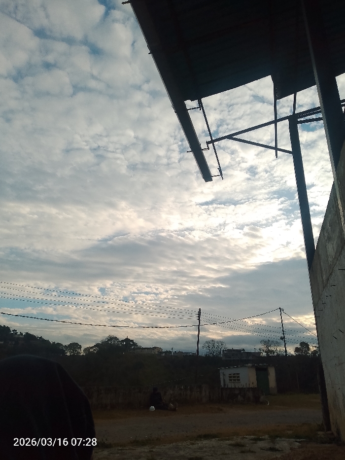 This image, taken on March 16, 2026, at 07:28 AM in Las Tejerías, Venezuela, depicts an outdoor scene under an overcast sky with scattered cumulus clouds, indicating dawn or early morning