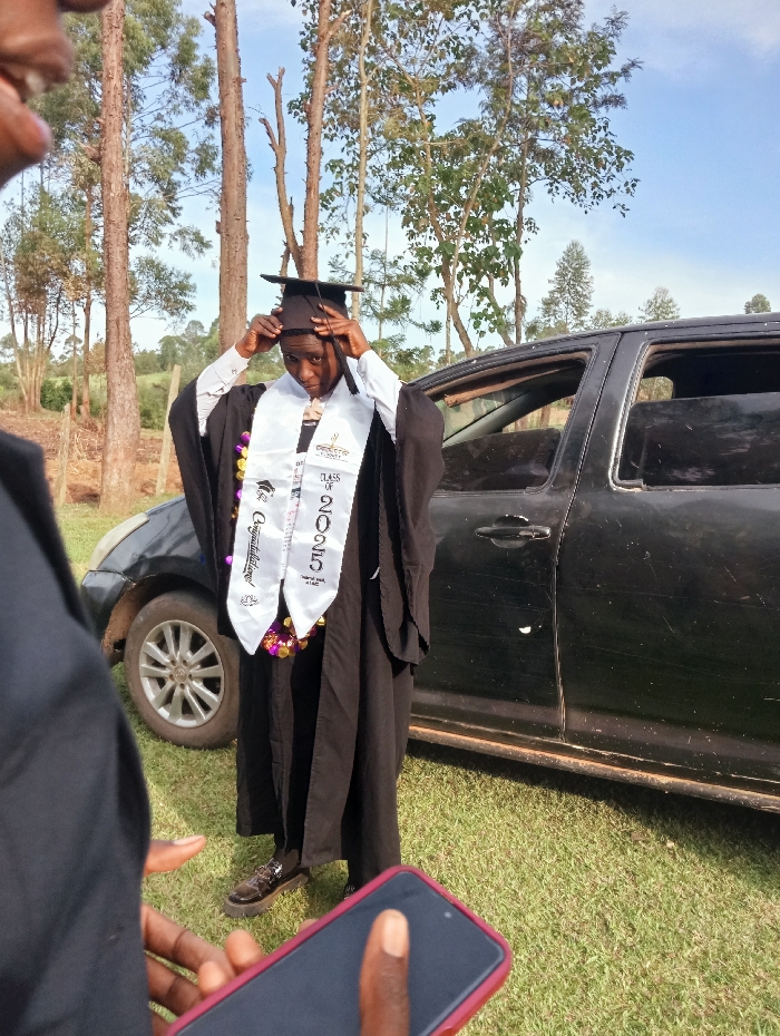A young graduate in cap and gown adjusts his mortarboard. He wears a graduation sash and stands near a black car. A second person partially obscures the view, holding a phone in their hand. The setting appears to be outdoors, with trees visible in the background. The sky is partly cloudy.