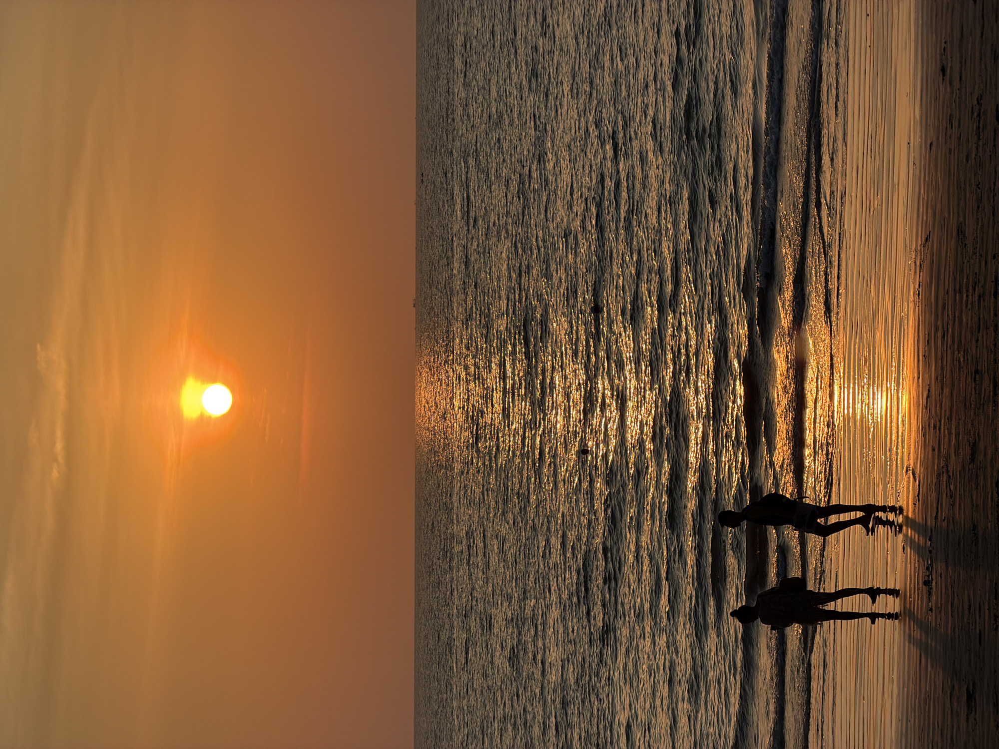 The image depicts a sunset scene on a beach in Kamala, Thailand. The sky is dominated by an orange-golden gradient, with a brilliant, circular white-yellow sun positioned in the upper center-right. The sun's light creates a shimmering golden path across the dark, rippling ocean surface, extending from the horizon towards the sandy shore. On the distant horizon, several faint silhouettes of small vessels are visible. A single dark, spherical object, possibly a buoy, floats in the ocean's mid-ground on the left side. Two human figures are silhouetted in the foreground, standing on the wet, reflective sand at the water's edge. The figure on the left, appearing female, is seen in profile, facing slightly right, wearing a top and shorts or a skirt, with hair styled in a bun or ponytail. A bag is visible on her left shoulder. The figure on the right, appearing male, is also in profile, facing left, wearing a tank top and shorts, with his right arm slightly raised. Both figures cast long, dark shadows onto the wet sand. Small waves are breaking near their feet. The immediate foreground shows textured, darker sand further from the water line.