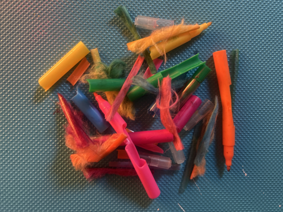 A disorganized pile of brightly colored marker caps, marker bodies, and clear cap tops rest on a textured, light blue surface. The markers are yellow, orange, green, blue, and pink. Streaks of dyed wool resembling marker ink color stain the nearby surface. The orange marker body is lying by itself, detached from the rest.