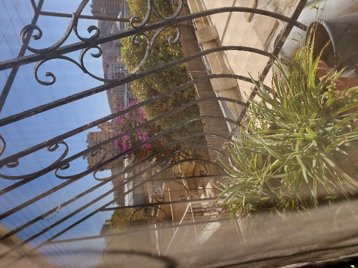 The image depicts an exterior view from behind a dark, weathered wrought iron railing with decorative scrolls, likely from a balcony or window in the city of Unknown, Unknown