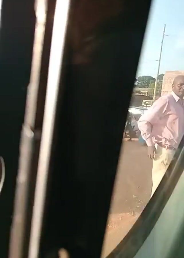From inside a vehicle, the video shows a view through the vehicle window. Outside, a man in a pink shirt and khaki pants stands with his hands on his hips. He appears to be watching a group of people near a white vehicle in the distance. The camera pans slightly to show an orange bus with "WAYA" written on the side. People are walking near the bus. A woman in a white and blue patterned dress stands near the window.
