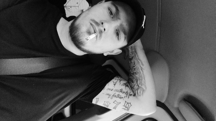 This black and white photograph, taken in Senec, Slovakia, depicts a male subject seated within what appears to be the interior of a vehicle. The male is positioned centrally, looking directly at the camera. He wears a dark baseball cap with a visible light-colored logo and a dark t-shirt. Facial hair, including a beard and mustache, is present. A lit cigarette is held between his lips. His right arm is bent and raised, with his hand possibly resting behind his head or against the vehicle's interior. Extensive tattoos are visible on his right arm, including a full sleeve pattern on the upper arm and script reading "There is one authority for me - my father!" on the inner bicep area, alongside other designs. A dark seatbelt is taut across his chest. The vehicle's headliner is visible in the upper background, and a vehicle pillar or door frame is partially visible on the right. The overall scene is a close-up, likely a selfie, taken in a low-light or shaded environment.