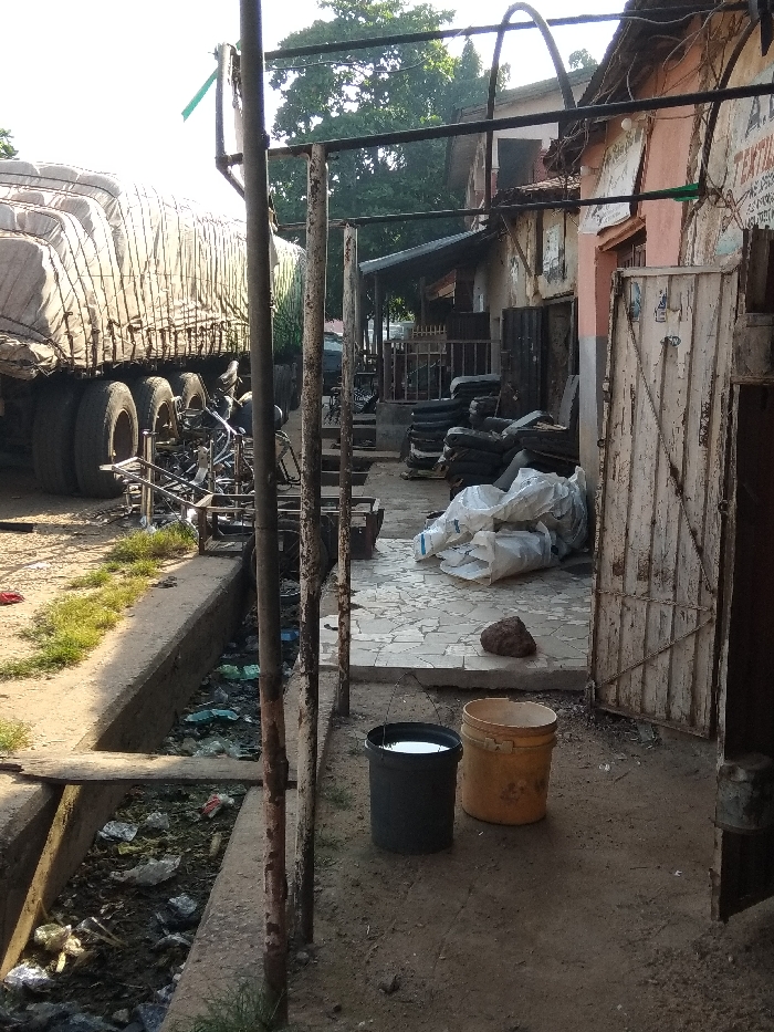 This image displays a street scene in Maiburiji, Nigeria, under daylight. On the left, a large, multi-axle truck covered by a light-colored tarp is parked next to a concrete drainage ditch filled with refuse. A rusty metal framework occupies the central foreground. To the right, a weathered building with an orange-peach facade features peeling paint and partially visible signage, including "TEXTILE." An open, white wooden double door or gate reveals an interior section. On the dirt ground in the immediate foreground are a dark bucket containing water and an empty light-colored bucket. The midground includes a paved area with stacked black objects resembling tires, several large white plastic bags, and a reddish-brown rock. Further back, additional structures and dense green trees are visible against a bright sky. No people are present.