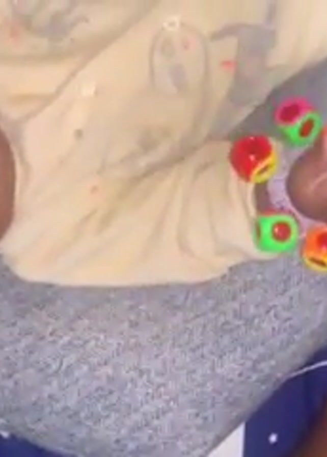 A baby is lying on their back in a curved pillow, wearing a yellow onesie, with a toy around their wrist. The baby’s skin tone is brown. The baby is looking up. The pillow is gray with a patterned texture. The sheets are blue with white stars and stripes. A dark hand reaches into frame on the right side. Background audio is present, including the sounds of the baby and adults talking.