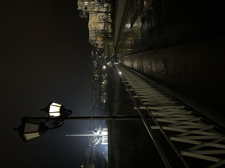The image depicts an urban night scene in Veliko Tarnovo, Bulgaria, under wet conditions, suggesting recent precipitation. The viewpoint is from what appears to be the Stambolov Bridge, oriented towards the city's east. In the immediate foreground on the left, a dark ornamental streetlamp post supports two lanterns, one square and one hexagonal, both emitting bright yellow light. A white metal railing with a repeated criss-cross pattern forms a barrier along the left side of a wet, dark asphalt or paved surface that constitutes a road or walkway. This surface, which reflects ambient light and displays visible puddles, extends into the midground, curving gently towards the right and ascending. Beyond the railing on the left, the terrain is dark and indistinct. In the background on the left, the Monument to the Assen Dynasty is prominently illuminated by several bright spotlights, revealing its tall, slender obelisk and multiple equestrian statues at its base. To the monument's right, the city of Veliko Tarnovo sprawls across a hillside, characterized by numerous scattered lights from buildings and streetlamps. Further to the right in the background, a large, multi-story building with a classical architectural style and brightly illuminated windows, consistent with the St. Cyril and Methodius National Library or a similar institutional structure, stands out against the dark sky. The sky itself is uniformly dark, indicating nighttime and possibly overcast conditions. No individuals or vehicles are present within the frame.