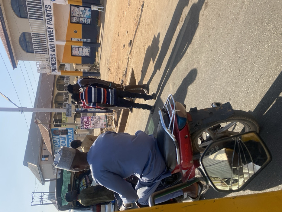 An outdoor street scene in Dadi Riba, Nigeria, is captured during daylight hours, characterized by bright sunlight casting long shadows