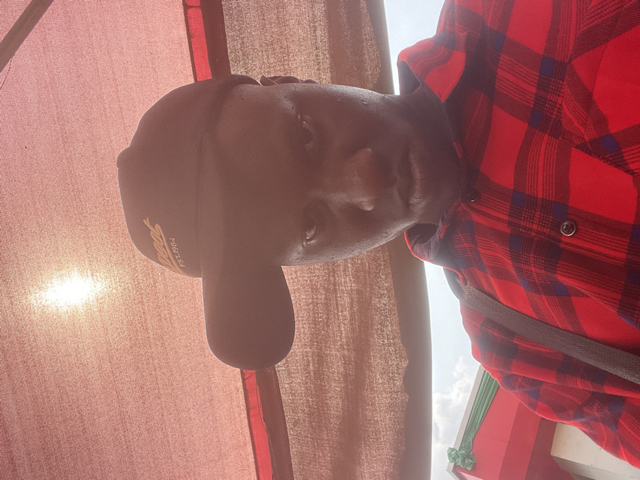 A male individual is depicted in a close-up, low-angle shot within the city of Asaba, Nigeria. He wears a dark baseball cap featuring a light-colored "Great FST.1964" logo and a red and black plaid flannel shirt. A dark strap, possibly from a bag, is visible over his right shoulder. He maintains direct eye contact with the camera, exhibiting a serious expression with slightly narrowed eyes. The upper portion of the frame is dominated by a translucent, reddish-orange fabric canopy, through which a bright, diffused light source, consistent with sunlight, is visible. In the lower-left background, beneath the canopy, a section of a building with a red roof and green decorative trim is visible, with a light blue, partly cloudy sky above it.