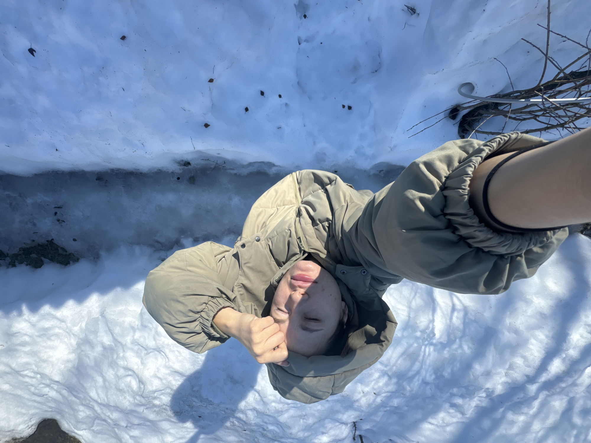 A person is lying on their back in the snow in Красный Маяк, Russia. The person is wearing a hooded, olive-green puffer jacket. Their face is partially obscured by their hand, and their eyes are closed. The background consists of snow, ice, and some bare branches of vegetation. A narrow channel of water or ice runs through the snow.