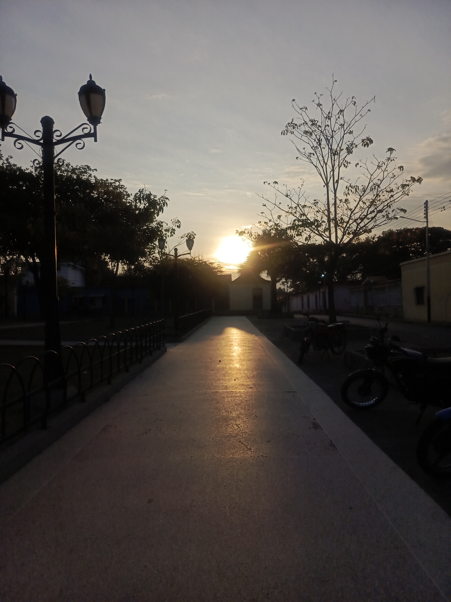 street scene in Tinaco, Venezuela during sunset. The road is paved and reflects the light of the setting sun. On the left side of the road, there is a black metal fence and a street lamp. On the right side, there are several parked motorcycles. In the background, there are buildings and trees silhouetted by the sun. The sky is light with some clouds.