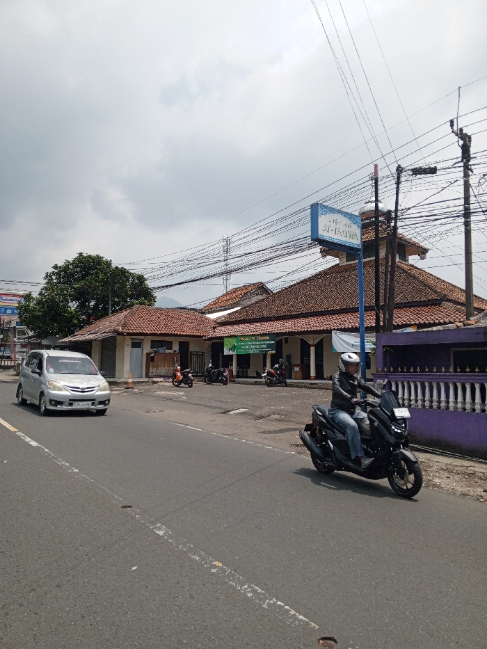 The scene depicts an outdoor street view in Multhan, India, under an overcast sky. A two-lane asphalt road with faded white markings occupies the foreground and midground. A silver minivan, bearing license plate 'D 1006 MNT', drives on the left side of the road, approaching the viewer. Simultaneously, a dark-colored scooter, operated by an individual wearing a white helmet, dark jacket, and blue jeans, rides on the right side of the road, also moving towards the viewer. On the right side of the road, a complex of single-story buildings with reddish-brown tiled roofs is visible. A prominent structure is identified by a blue and white sign reading 'Masjid Jami Al-Taqwa', indicating a mosque with a small dome-like finial on its roof. A green banner is displayed on the mosque's facade. To the left of the mosque, a building with a closed metal rolling shutter, and an orange traffic cone nearby, suggests a storefront. Multiple scooters are parked on the paved area in front of these buildings. A low purple fence with white balusters runs along the property boundary. Utility poles with numerous overhead wires crisscross the upper portion of the frame. A tall metal lattice tower stands in the background to the left of the mosque. A large green tree is situated behind the minivan on the left. A partial red and blue sign, possibly 'Indomaret', is visible on the far left. A mountain range is faintly discernible in the distant background beneath the cloudy sky.