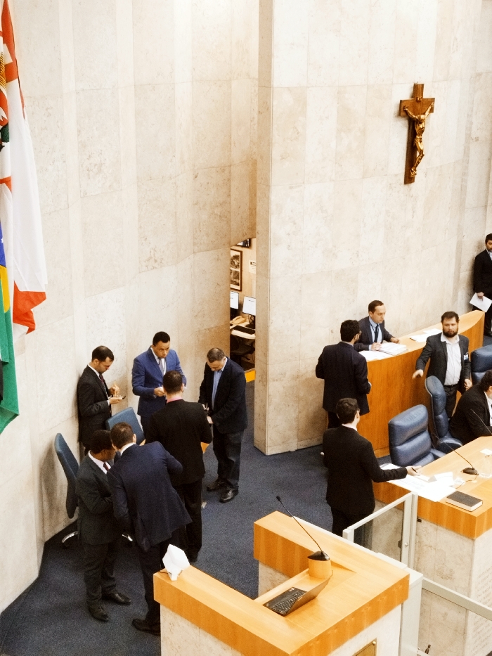 An indoor scene captures a group of formally dressed individuals in a room with high ceilings. Men in suits gather in small groups, some standing while others are seated at desks. A religious cross adorns the wall above the gathering. A flag is also visible on the left side of the scene. The room is carpeted, and the walls appear to be made of a light-colored material.