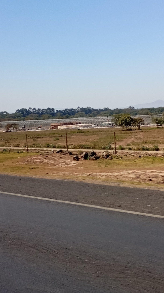 A roadside view features a dark asphalt road in the foreground. Beyond, a field transitions to a construction or industrial site with long, white structures resembling greenhouses. Trees line the distant horizon, with a clear blue sky above. The landscape suggests a rural setting with evidence of human modification.