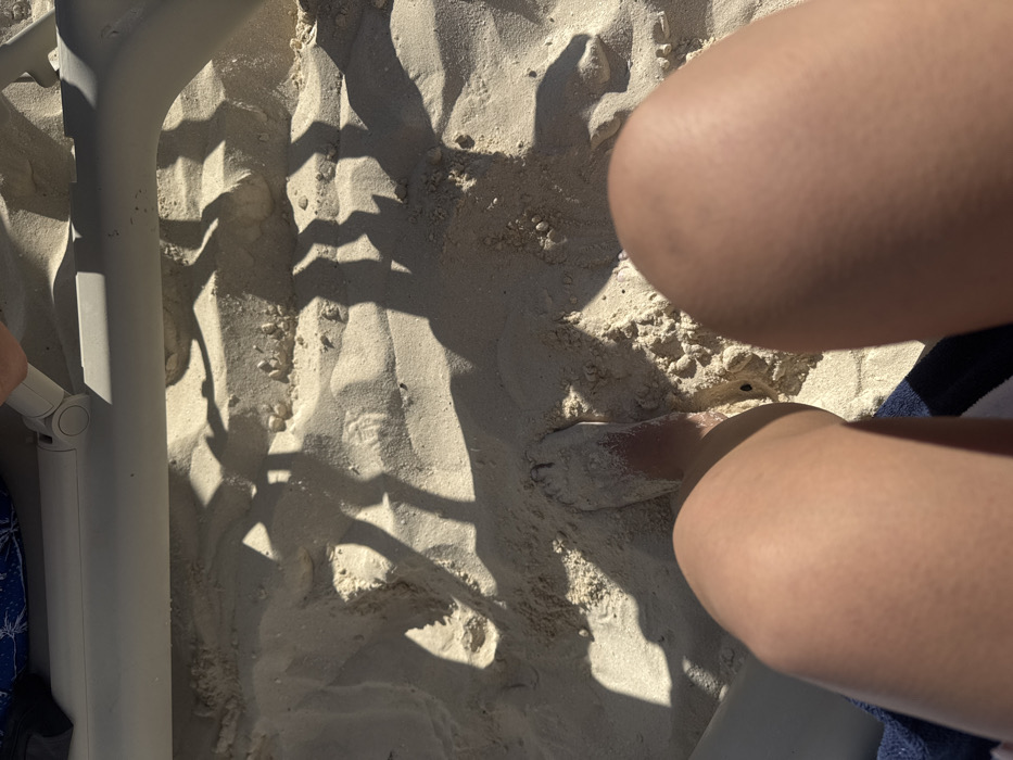 A top-down view reveals a sun-drenched scene of white sand. A chair leg and jagged shadows from the chair itself extend across the sand. A person's legs rest on the chair, partially covered in sand, with a hint of blue fabric visible on the edge of the seat. The lighting is bright, creating strong contrasts between the light sand and dark shadows.
