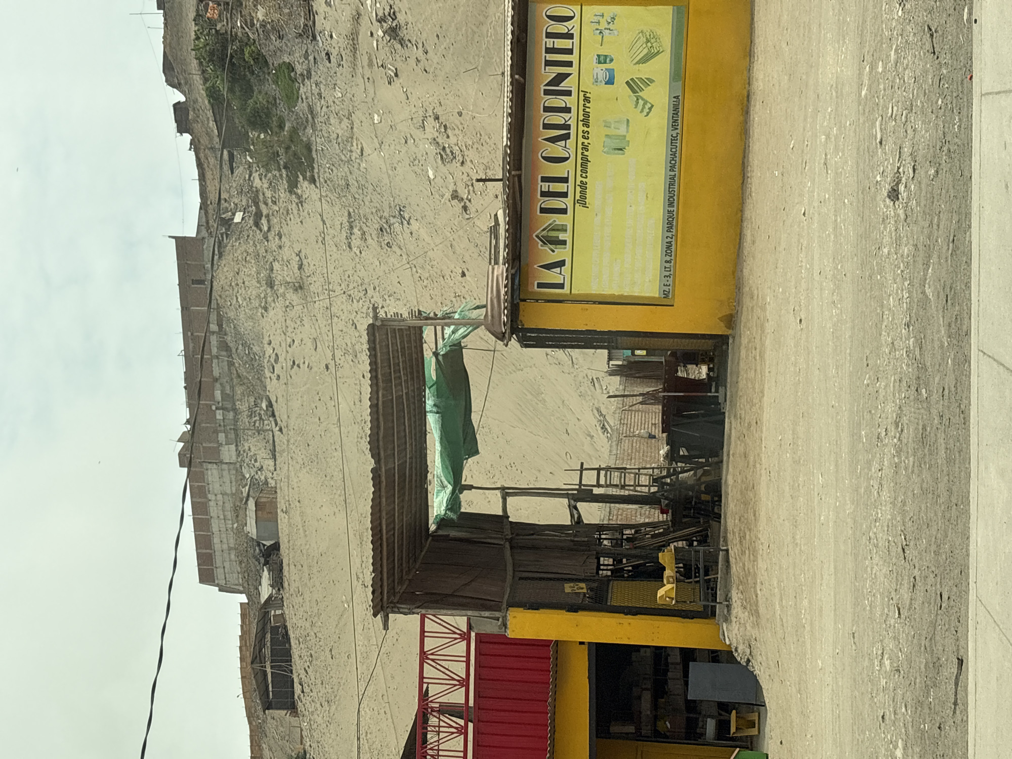 street scene in Mi Perú, Peru. On the right side of the image, there is a building with a yellow sign that reads "LA DEL CARPINTERO" (The Carpenter), along with an advertisement and the address: MZ. E-3, LT. 8, ZONA 2, PARQUE INDUSTRIAL PACHACUTEC, VENTANILLA. The building is partially obscured by a makeshift shelter or lean-to constructed from corrugated metal roofing and wooden supports. Underneath the shelter, there is an assortment of lumber, metal, and various unidentified objects. In the background, there's a steep, sandy hillside with informal housing structures built on its slopes. The road appears unpaved, with a rough, sandy surface. The sky is overcast.