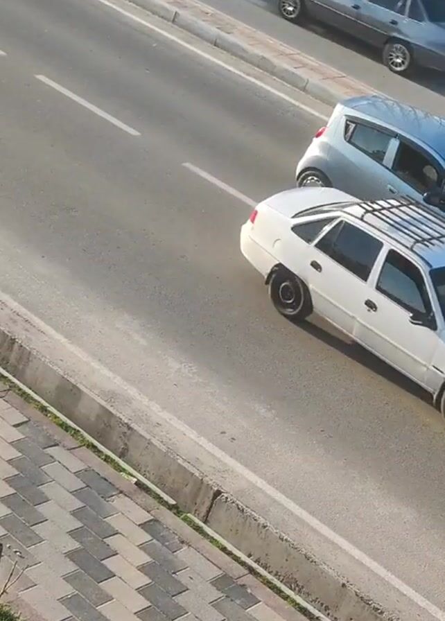 From a high angle, the camera shows a section of a road, adjacent to a sidewalk, with three vehicles moving