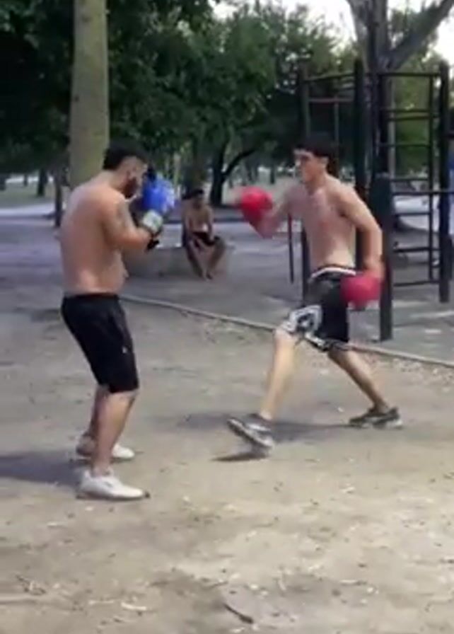 Two shirtless men are boxing in a park. The man on the left is wearing blue gloves and black shorts, while the man on the right is wearing red gloves and black shorts with white stripes. They are circling each other, throwing punches. There are trees and exercise equipment in the background, and several other people can be seen sitting or standing nearby. The ground is dirt.