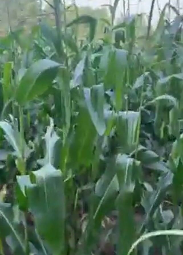 dense cornfield with tall stalks of corn. The camera moves through the field, showing rows of corn plants with green leaves and stalks. Some of the corn plants have tassels at the top. The sky is overcast.