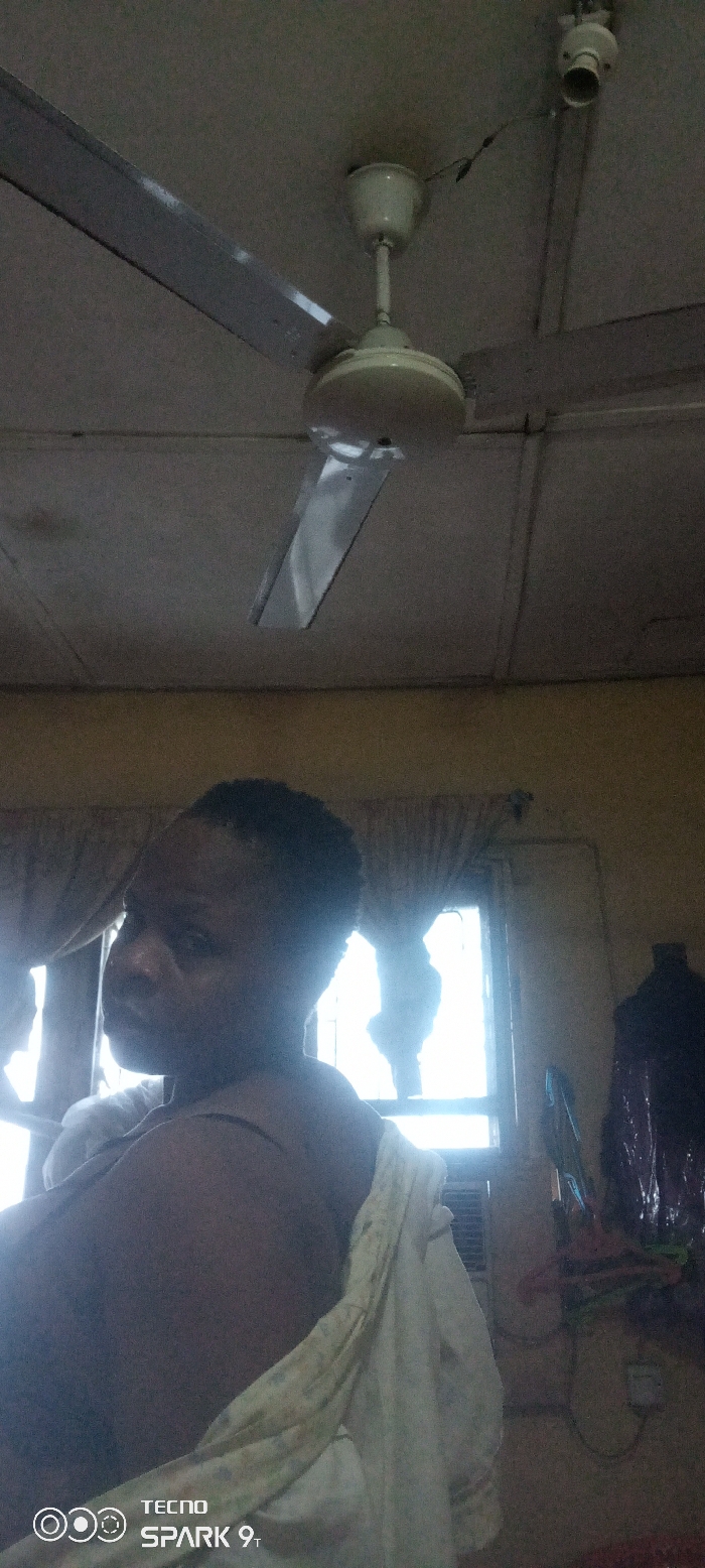 The image depicts an indoor, low-light scene featuring an adult female with dark skin and short, dark hair. She is positioned with her left side partially facing the camera, head turned slightly to the left. A light-colored, patterned fabric is draped over her right shoulder and arm. The room is dimly illuminated, with a brightly lit window on the right side casting strong backlight through partially drawn, patterned curtains. A cream-colored three-blade ceiling fan is mounted on the paneled ceiling, adjacent to an empty light bulb socket. The walls are painted a faded beige or yellow. Indistinct objects are visible on the far right. The image includes a "TECNO SPARK 9T" watermark in the bottom left corner. No specific visual identifiers within the image provide a precise location within Lagos, Nigeria.