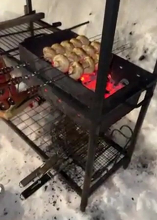 - "A man is using skewers to cook mushrooms over hot coals on a charcoal grill outside in the snow" by FM-keT4P2, licensed under CC BY 4.0