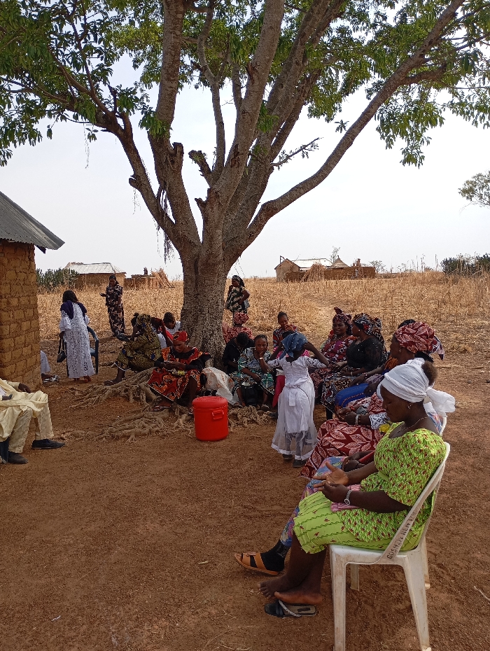 The scene depicts a communal gathering in Tambes, Nigeria. Approximately 15-20 individuals, predominantly women and some children, are assembled outdoors under a large, partially defoliated deciduous tree with prominent exposed roots. The ground consists of dry, reddish-brown soil. To the left, a mud-brick building with a corrugated metal roof is visible. In the background, a parched field with dry vegetation and scattered crop remnants extends, punctuated by several distant, smaller mud-brick structures. The sky is clear and bright, indicating daytime. Most individuals are seated or standing. A woman in a light green patterned dress and white headwrap occupies a white plastic chair in the foreground. To her left, a red plastic container is positioned on the ground. Further left, a man in light-colored traditional attire is seated on a low stool. Other women, dressed in various colorful traditional garments and head wraps, are seated on the ground or low stools, forming a cluster around the tree's base. A child in a white dress stands near the center of the gathering. The individuals appear to be engaged in a communal meeting or social interaction.