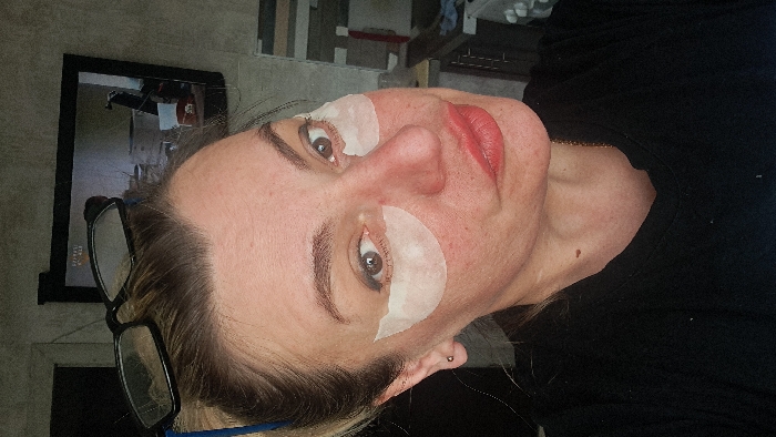 An adult female is depicted in a close-up portrait taken indoors, likely within a residence in Elektrostal, Russia. Her light-colored hair is pulled back, with black-framed eyeglasses resting on her head. Two translucent under-eye patches are applied beneath her eyes, which are made up with dark eyeliner. Her eyebrows are defined, and her lips are covered with red lipstick. A small gold-colored stud earring is visible in her left ear, and a thin gold-colored chain hangs around her neck over a black V-neck t-shirt. She maintains direct eye contact with the camera. The background consists of a concrete-textured wall to the left, and a black-framed television displaying an interior scene with partial text. To the right, a section of patterned or tiled wall and a counter with household items are visible, consistent with a kitchen environment.