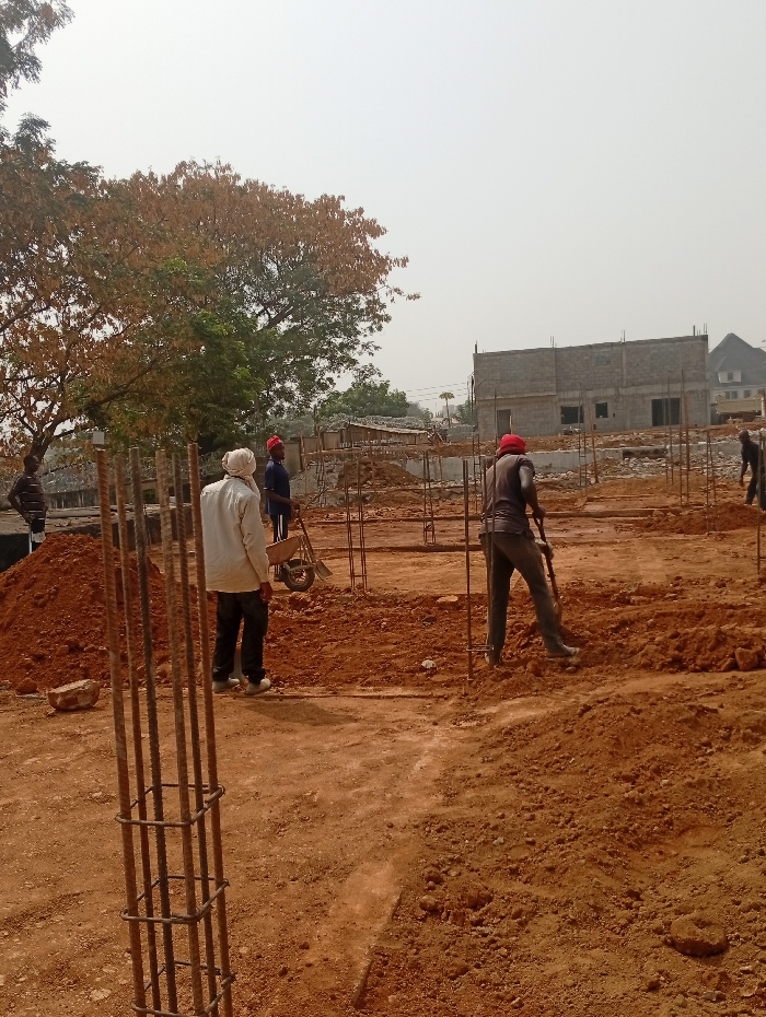 The image displays an active construction site in Abuja, Nigeria, under a bright, hazy sky