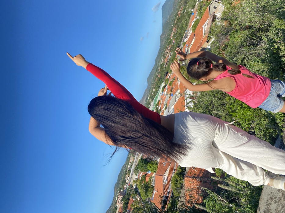 From an elevated perspective, a woman in a red shirt and white pants points towards the clear blue sky, standing near a young girl in a pink tank top and denim shorts. The girl's arms are extended, mimicking a similar gesture. Behind them lies a landscape of red-roofed buildings nestled among green trees and hills, creating a vibrant, scenic backdrop.