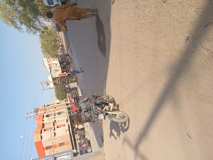 A street scene under a bright sky presents a man riding a motorcycle on the left. A pedestrian wearing a brown garment walks in the opposite direction on the upper side of the street. Buildings are visible behind the motorcyclist. The street's surface appears uneven, with a shadow stretching across the foreground. Trees and other pedestrians can be seen farther down the road.