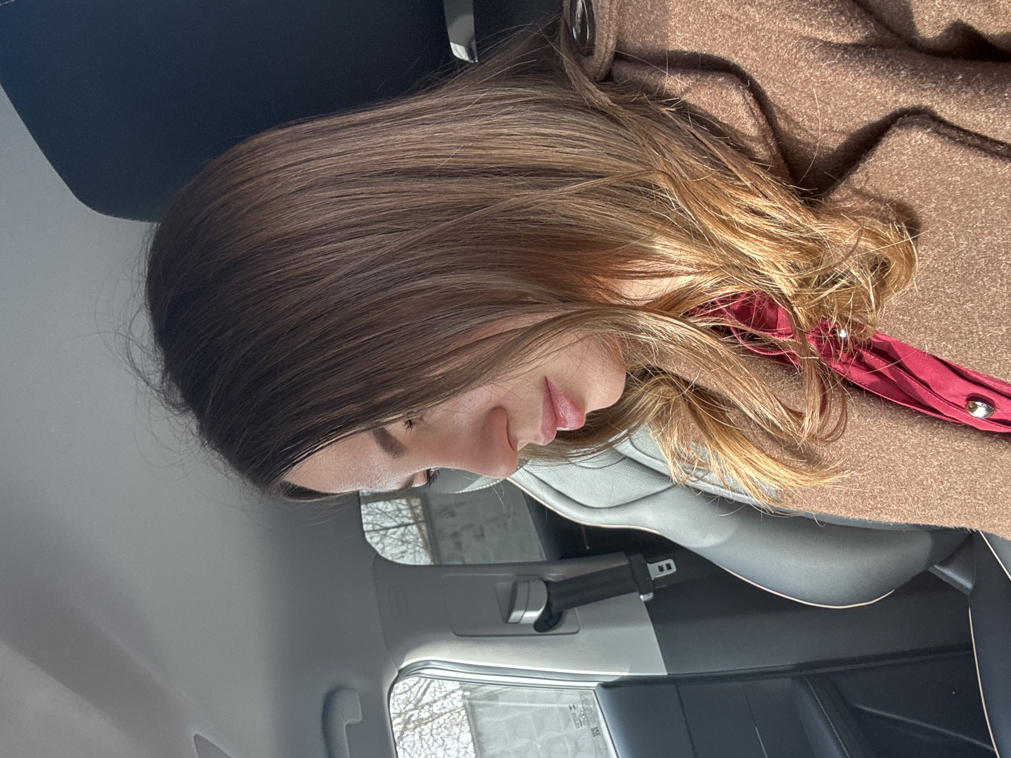 A female individual is depicted seated in the front passenger seat of a vehicle, positioned in profile facing towards the lower left of the frame. She possesses medium-length brown hair with lighter, sun-highlighted ends. Her attire consists of a brown, textured outer coat or jacket worn over a visible red inner garment. Her gaze is directed downwards and slightly forward. The vehicle's interior features a grey leather seat with light-colored piping, a dark-colored door panel, and a visible seatbelt mechanism on the B-pillar. Strong natural sunlight illuminates the subject from the right, creating highlights and shadows. Through the rear passenger window, bare tree branches and a light-colored wall or fence are visible in the background. The specific location within Orekhovo-Zuyevo, Russia, cannot be determined from the visual information presented.