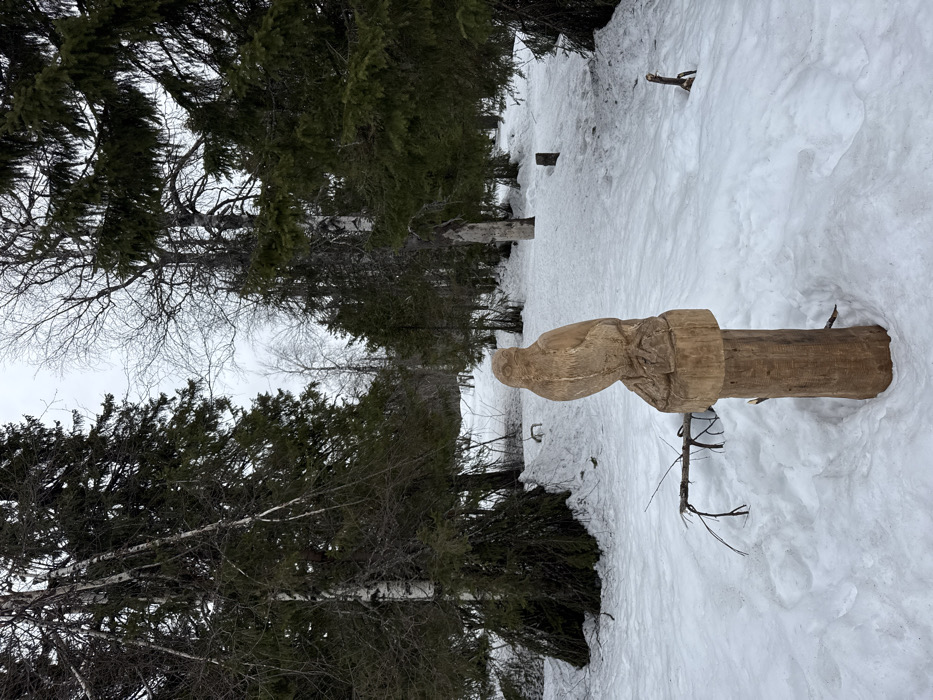 The scene depicts a snow-covered forest in Усьва, Russia. A carved wooden sculpture of a bird, resembling an owl or a raptor, is prominently featured in the foreground, positioned centrally. The sculpture is mounted on a debarked, cylindrical wooden post, approximately waist-height, with visible wood grain. The bird carving exhibits defined feathers and facial features. The ground is uniformly covered in white snow, with minor depressions and scattered bare branches. The background is composed of a dense mix of tall evergreen conifer trees with dark green foliage and slender, bare deciduous trees, primarily birches with light-colored bark. The sky is overcast and light grey. No individuals are present, and the environment is static.