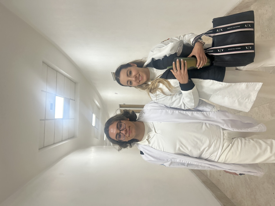 The image depicts two individuals, one male and one female, standing within a brightly illuminated, white-walled hallway of a medical or academic facility in Interlomas, Mexico