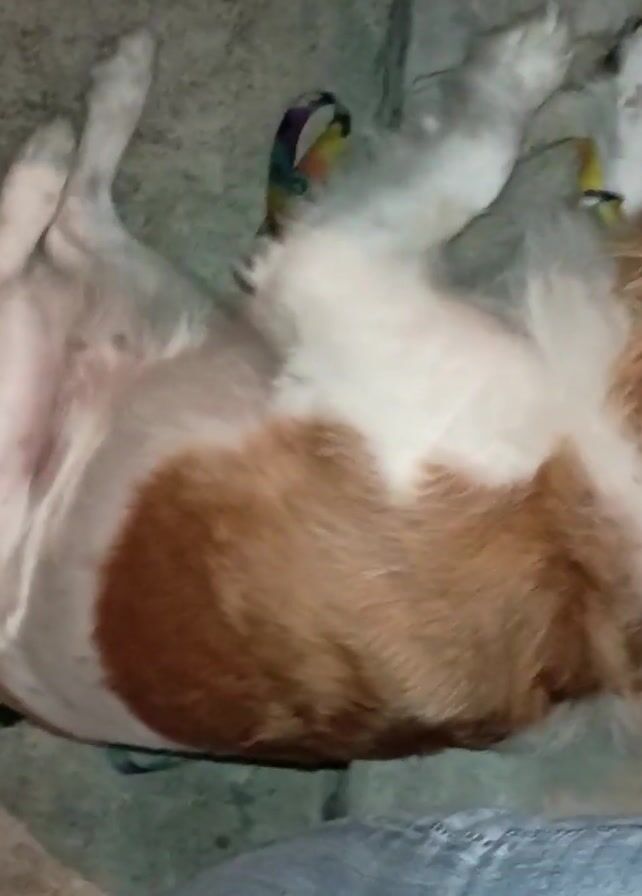 - "A tan and white long-haired dog is lying on its back on a concrete surface" by FM-TkLGE2, licensed under CC BY 4.0