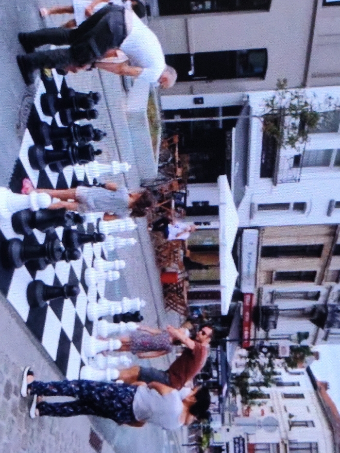 - "The image displays an active urban street scene in Charleroi, Belgium, featuring a large outdoor chessboard with oversized black and white pieces on a paved surface" by FM-DQLU42, licensed under CC BY 4.0